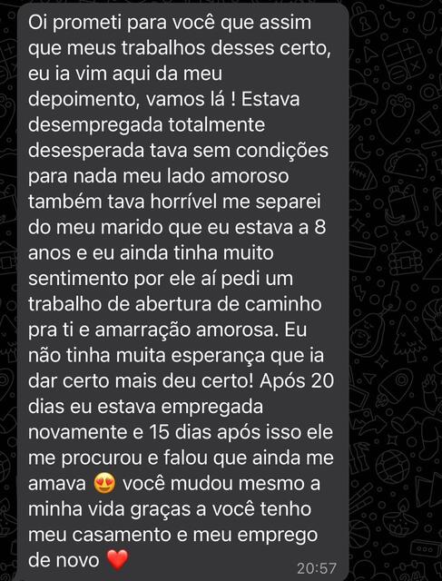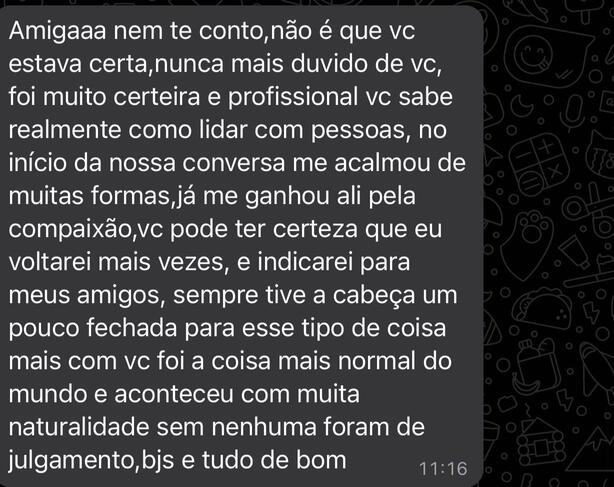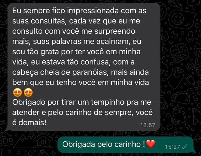 Minhas consultas são realizadas com sensibilidade e cuidado, sempre buscando trazer clareza e equilíbrio para a sua vida. Meu propósito é ajudar você a compreender os caminhos que o universo lhe reserva, oferecendo insights valiosos para escolhas mais conscientes e seguras.